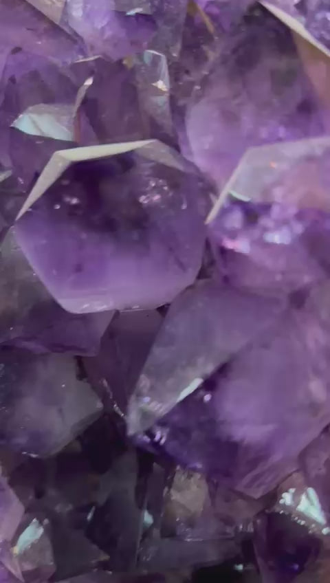 Esta geoda de amatista natural actúa como un auténtico núcleo de luz dentro del espacio donde se coloca. Sus cristales violetas nacen hacia el interior, creando un punto de concentración energética que ordena, limpia y estabiliza el ambiente de forma constante.